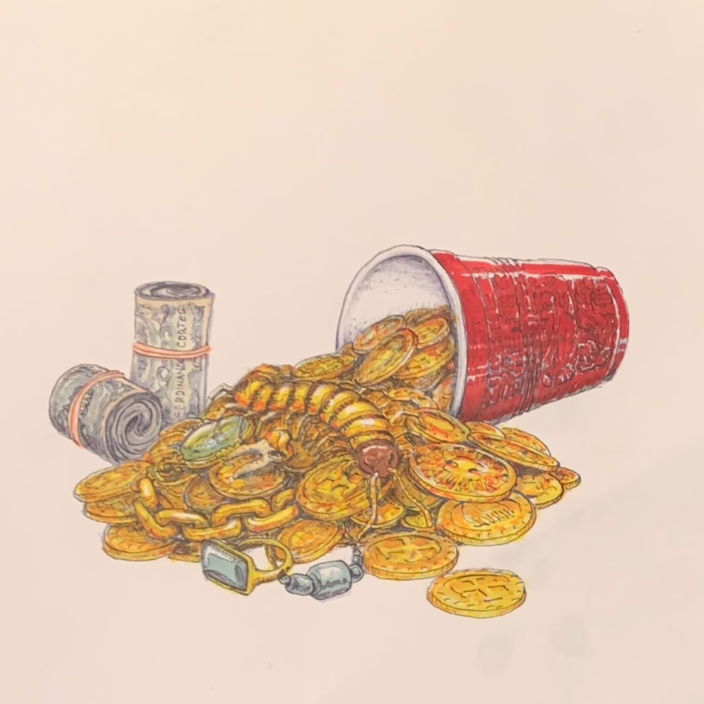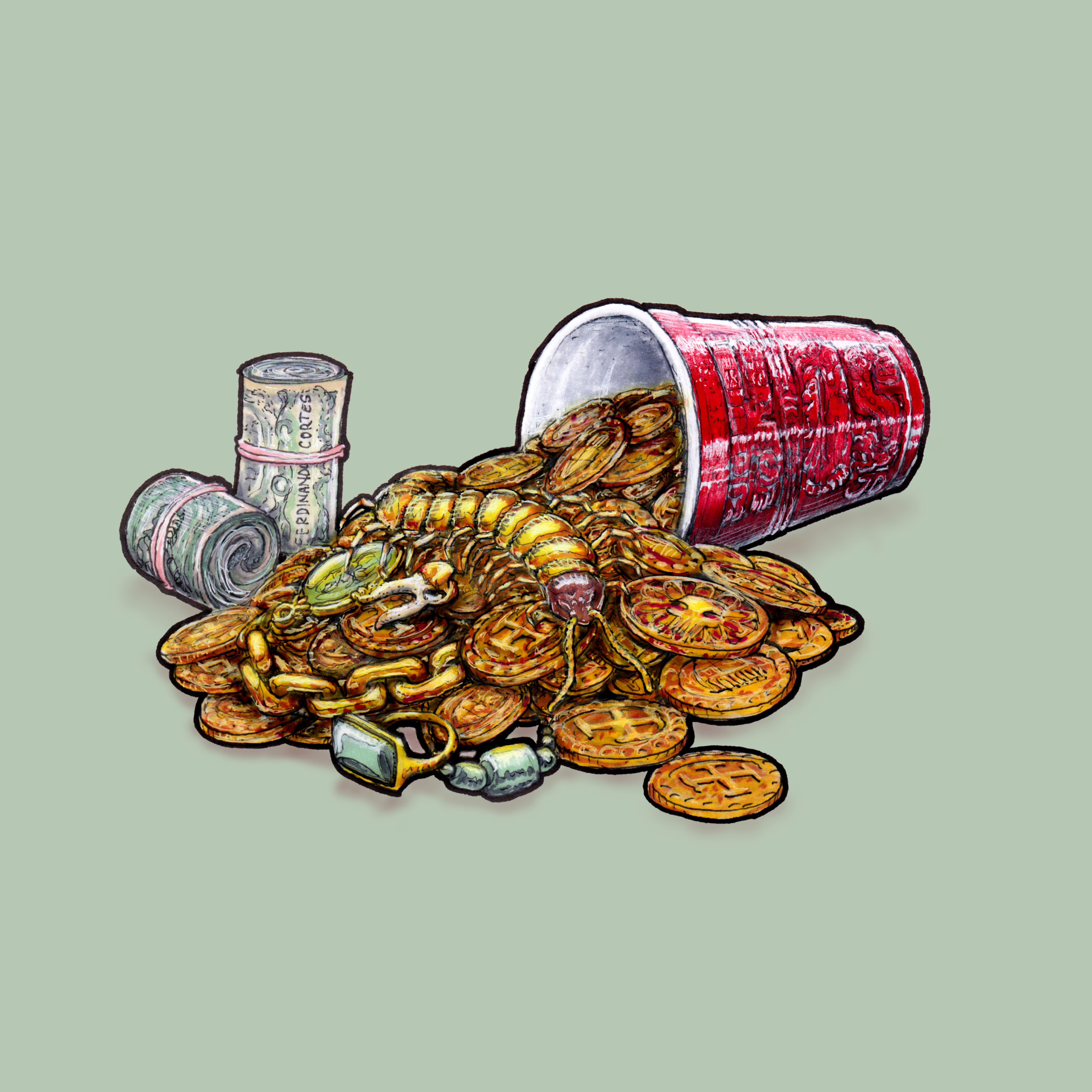 Jose “MoneyBag$” Rios contacted me for an album cover for his first single. Jose is a native of Mexico City and wanted to honor his heritage while celebrating new rap culture. Below you can see my process, from ideation and sketching through the finished piece.